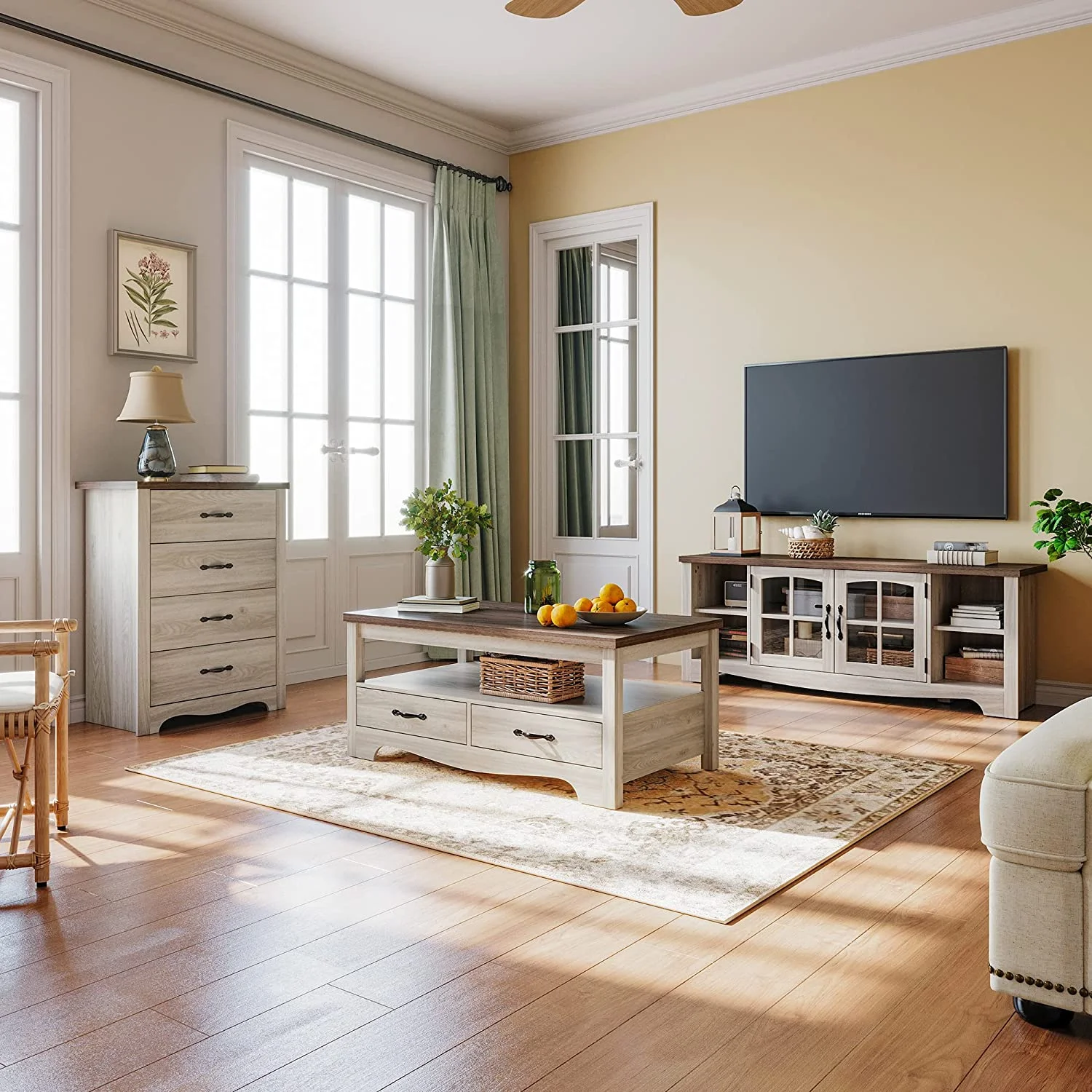 Bring warmth, style, and smart storage into your living space with the LINSY HOME Coffee Table with Storage Drawers. Designed with a charming farmhouse aesthetic, this versatile piece doubles as both a functional coffee table and a stylish TV stand, making it a perfect centerpiece for modern and rustic interiors alike.